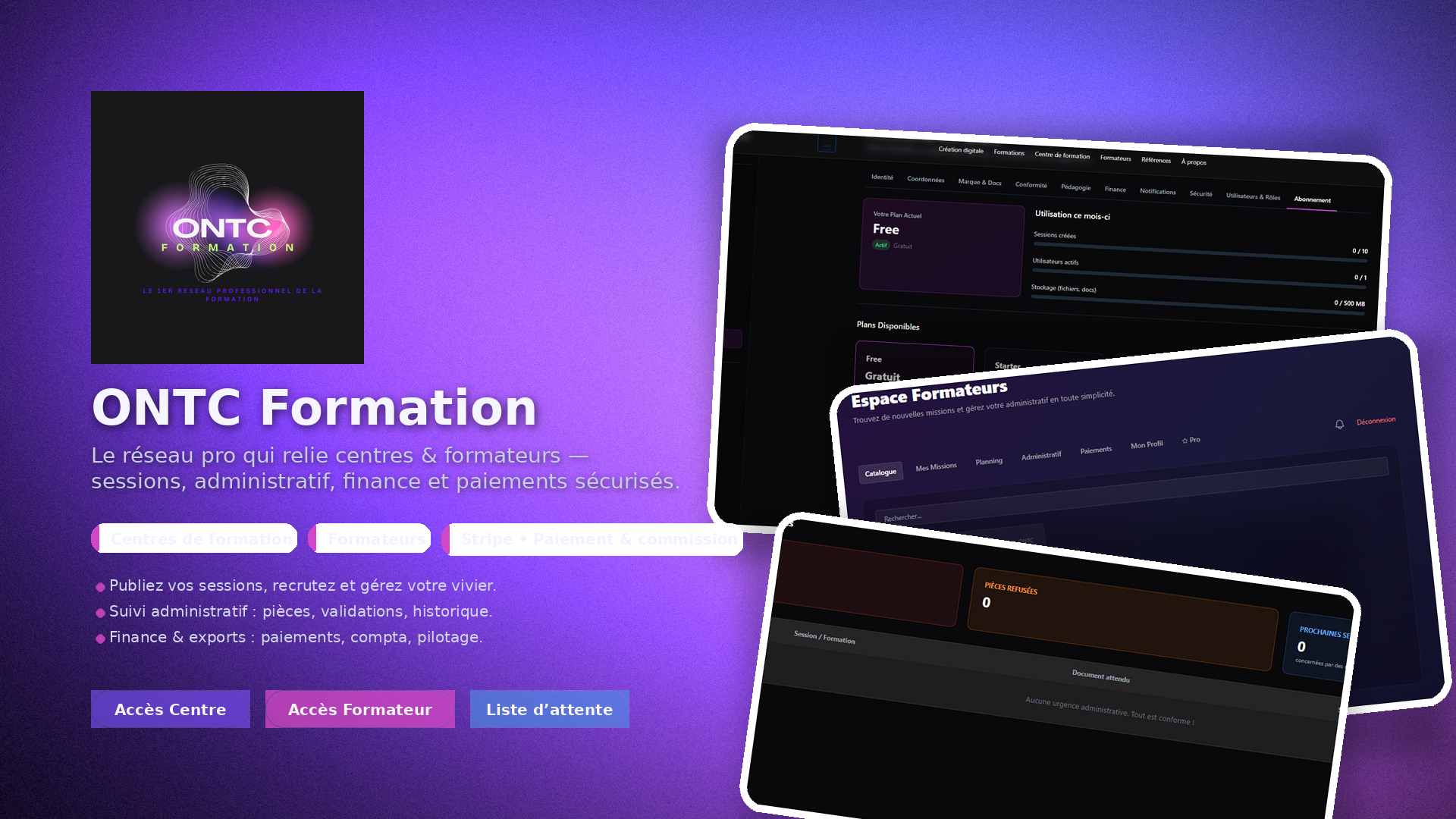 Une suite complète pour gérer vos sessions, vos formateurs et votre administratif. Concentrez-vous sur la pédagogie, ONTC gère le reste.